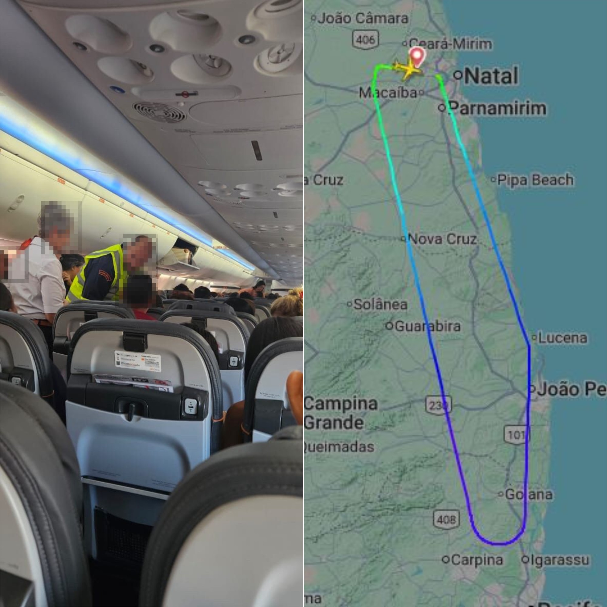 1 de 2 Passageiro passou mal e precisou ser atendido após problema em voo — Foto: Foto 1: Cedida | Foto 2: Divulgação/FlightRadar24